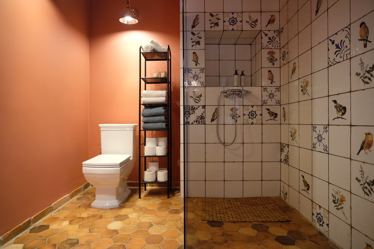 Łazienki zlokalizowane są na dwóch poziomach domu. Mniejsza znajduje się na piętrze żebyście w nocy nie odbywali długich wycieczek po schodach, duża na parterze żeby była w waszym zasięgu w ciągu upalnych dni.