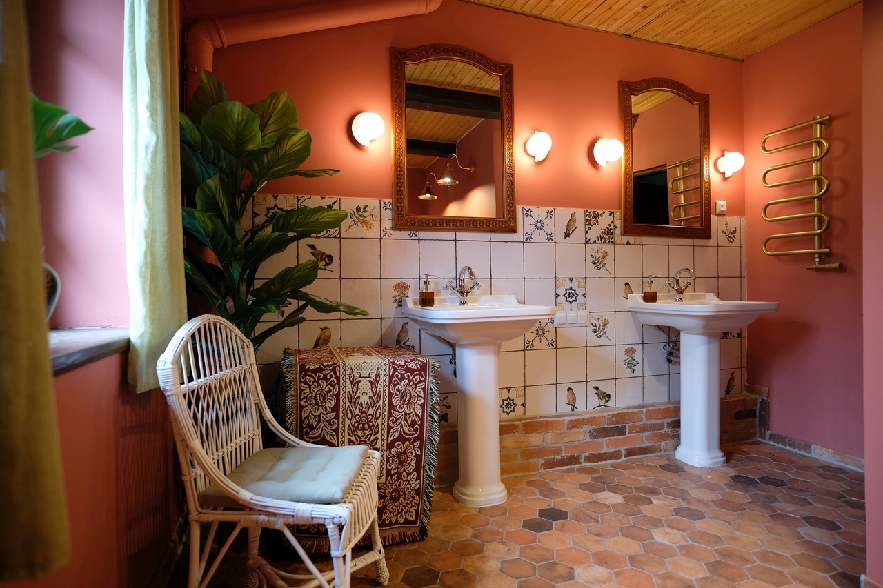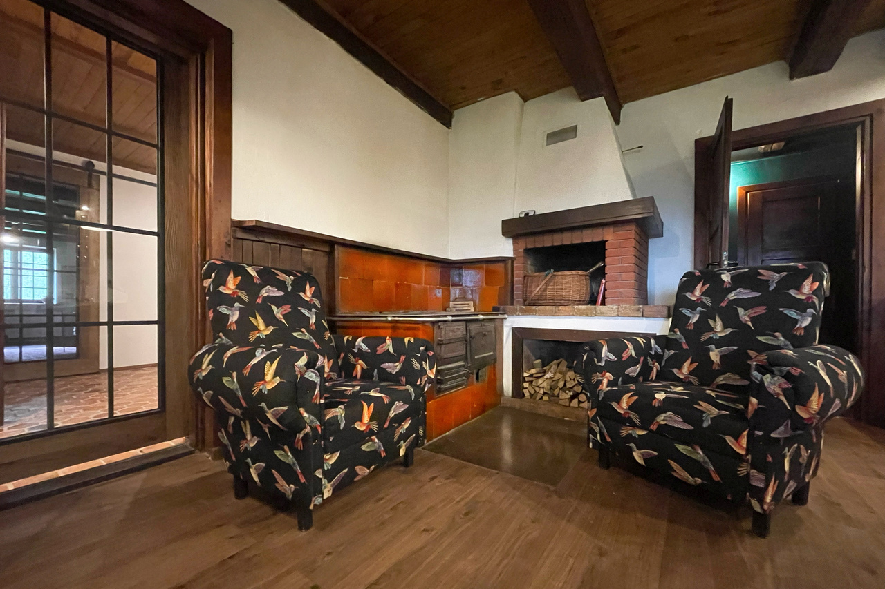 5 dwuosobowych sypialni, dwie strefy jadalne i dwie dzienne, dwie łazienki, dwa kominki, dwa hole.