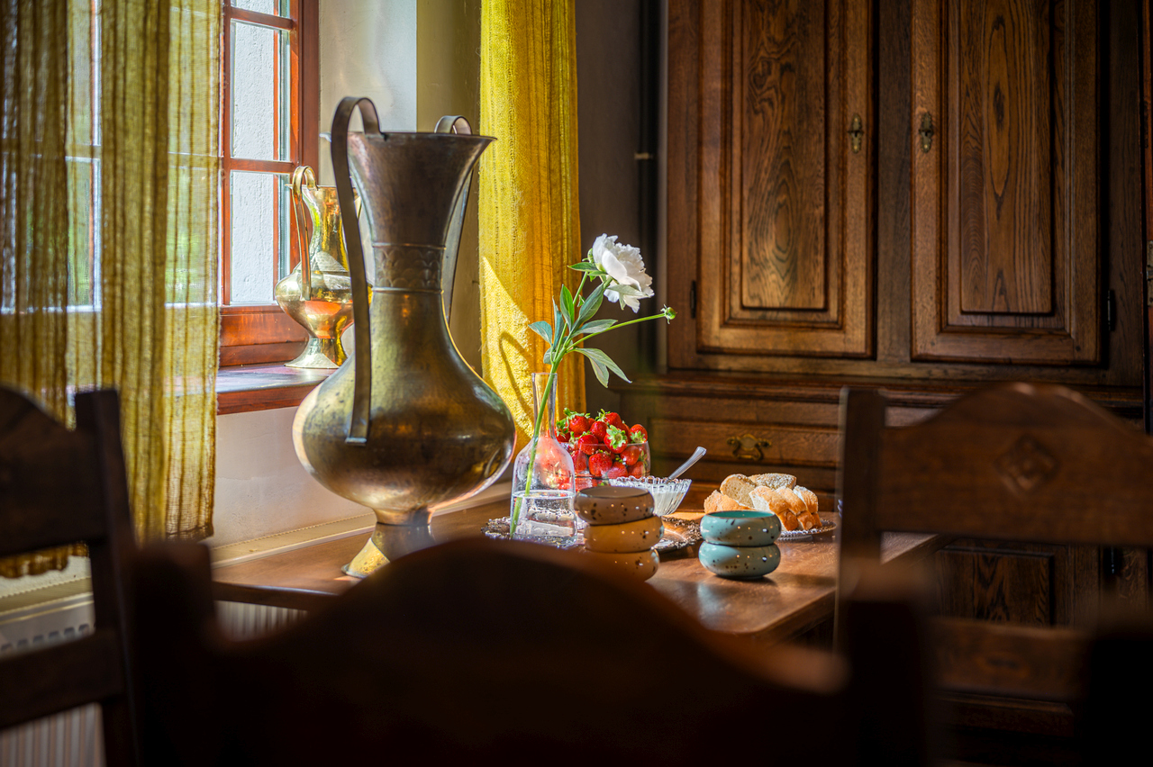 W sercu domu, czyli kuchni czeka na Was wiele niespodzianek. Od pełnego wyposażenia w sprzęty i szuflady pełne dobroci – bo nadmiar u nas jest, a nie niedosyt – przez okno z widokiem na Mamry, kameralny kącik jadalny, kanapę, fotele, po kominek i sprawną wiekową kuchnię kaflową, czy jak kto woli „fajerki”.